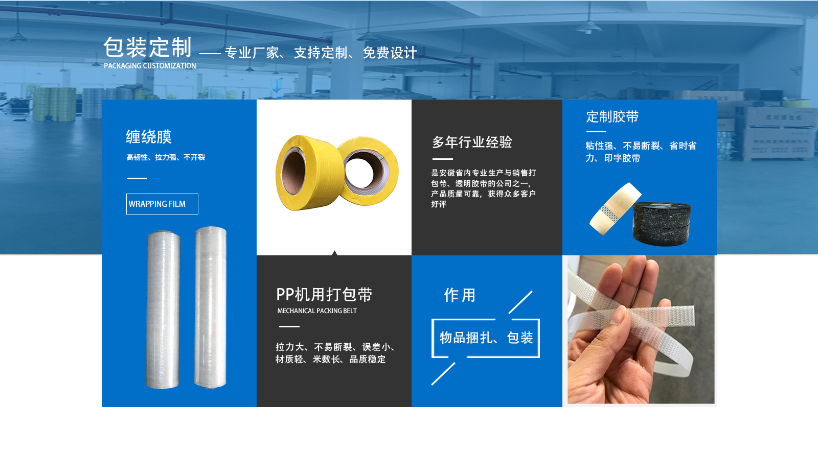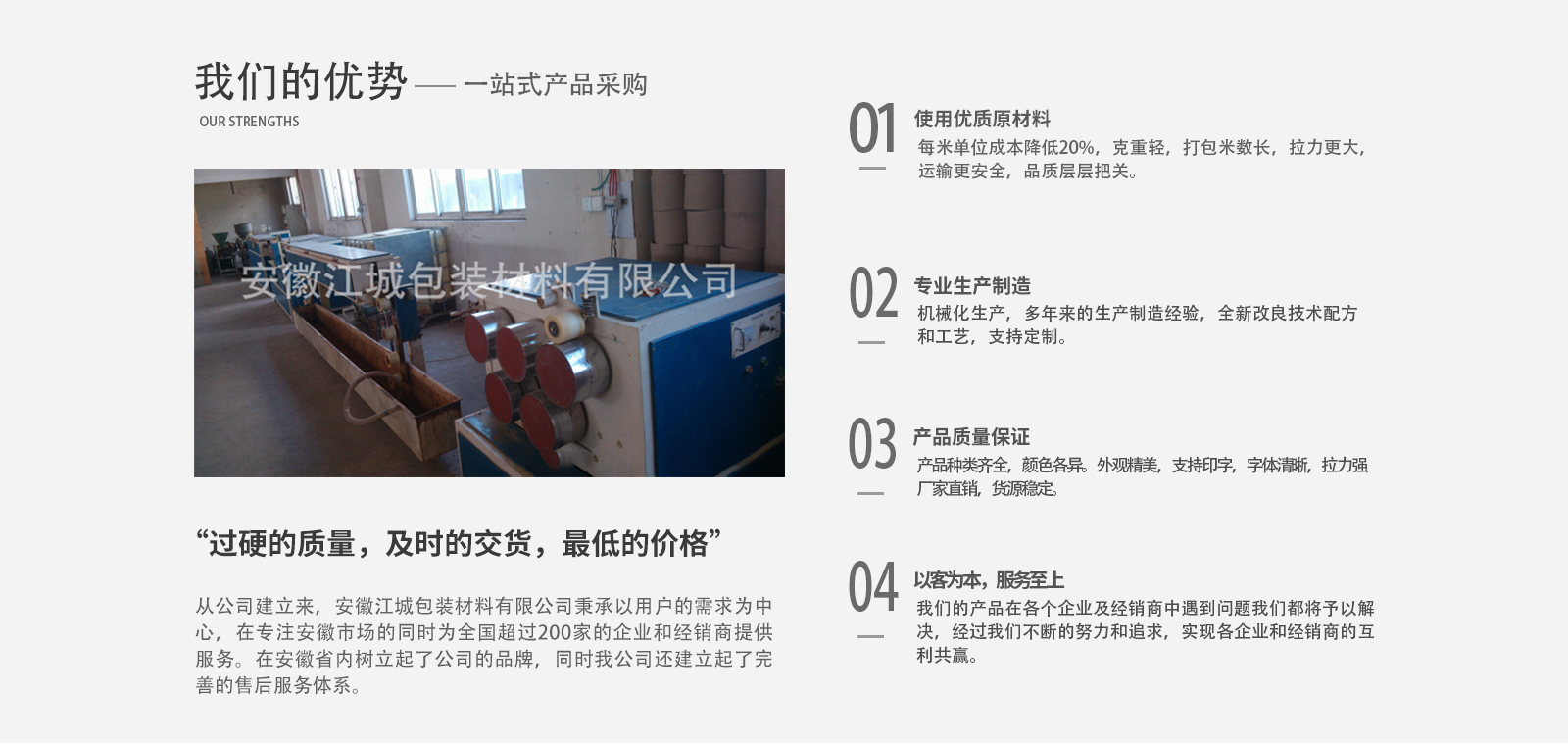 安徽江城包裝材料有限公司成立于2008年,注冊于2010年,公司總部設立在安徽蕪湖,是安徽省內專業生產與銷售打包帶、透明膠帶的公司之一。公司主要效勞于大中小企業,并大力開發省內經銷商。公司以“過硬的質量,及時的交貨,低的價格”,為企業的立身之本。希望用我們的不懈努力,帶給我們客戶大的效益。從公司建立來,安徽江城包裝材料有限公司秉承以用戶的需求為中心,在專注安徽市場的同時為全國超過200家的企業和經銷商提供服務,“過硬的質量,及時的交貨,低的價格”博得了縱多的企業和經銷商的好評,在安徽省內逐步樹立起了公司的品牌,同時我公司還建立起了完善的售后服務體系。為我們的產品在各個企業及經銷商中遇到的問題予以解決,經過我們不斷的努力和追求,實現各企業和經銷商的互利共贏。